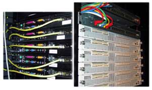 A wide variety of hardware is used throughout the network at different stages. Each rack of servers is controlled by an Alteon 184 Web Switch with either a FE (100Mbps/s) CAT5 uplink to the network, or GigE (1000Mbps/s) fiber uplink depending on bandwidth requirements. For normal applications, the Cisco 2924XL-EN Managed Switch is used for connectivity from the Alteon; for higher performance applications Dell PowerConnect 5224 Managed Switches with CAT5e (1000Mbps/s) ports are used.